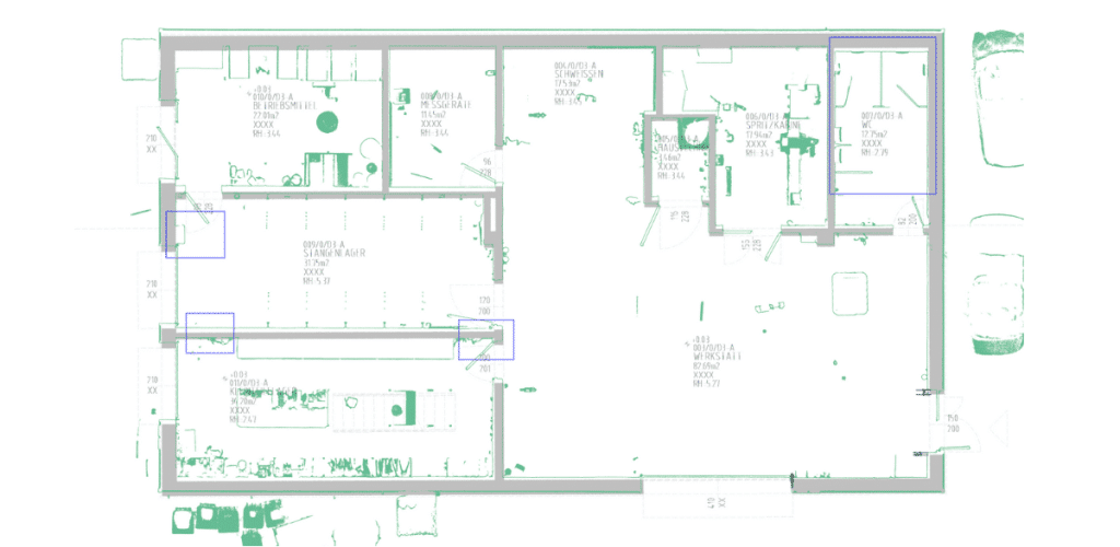 Highly accurate 2D layouts (floor plans, sections, elevations) created directly from the point cloud data, representing the true current state of your facility with millimeter-level precision.